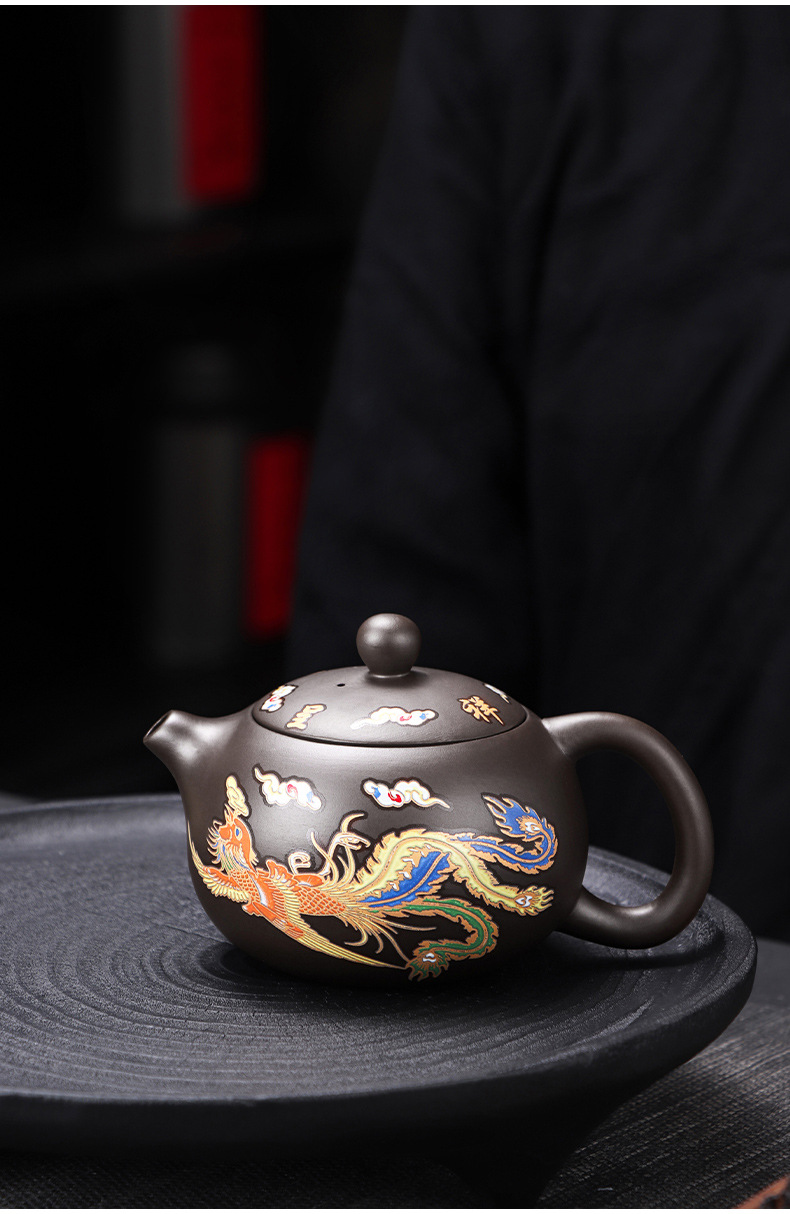 Điểm nhấn đặc biệt của bộ ấm trà này là khả năng thay đổi màu sắc khi rót nước nóng vào. Khi nhiệt độ thay đổi, họa tiết Long Phụng trên ấm trà hiện rõ, sống động như một bức tranh chuyển động, mang lại trải nghiệm thú vị và độc đáo cho người thưởng trà. 🫖🌟